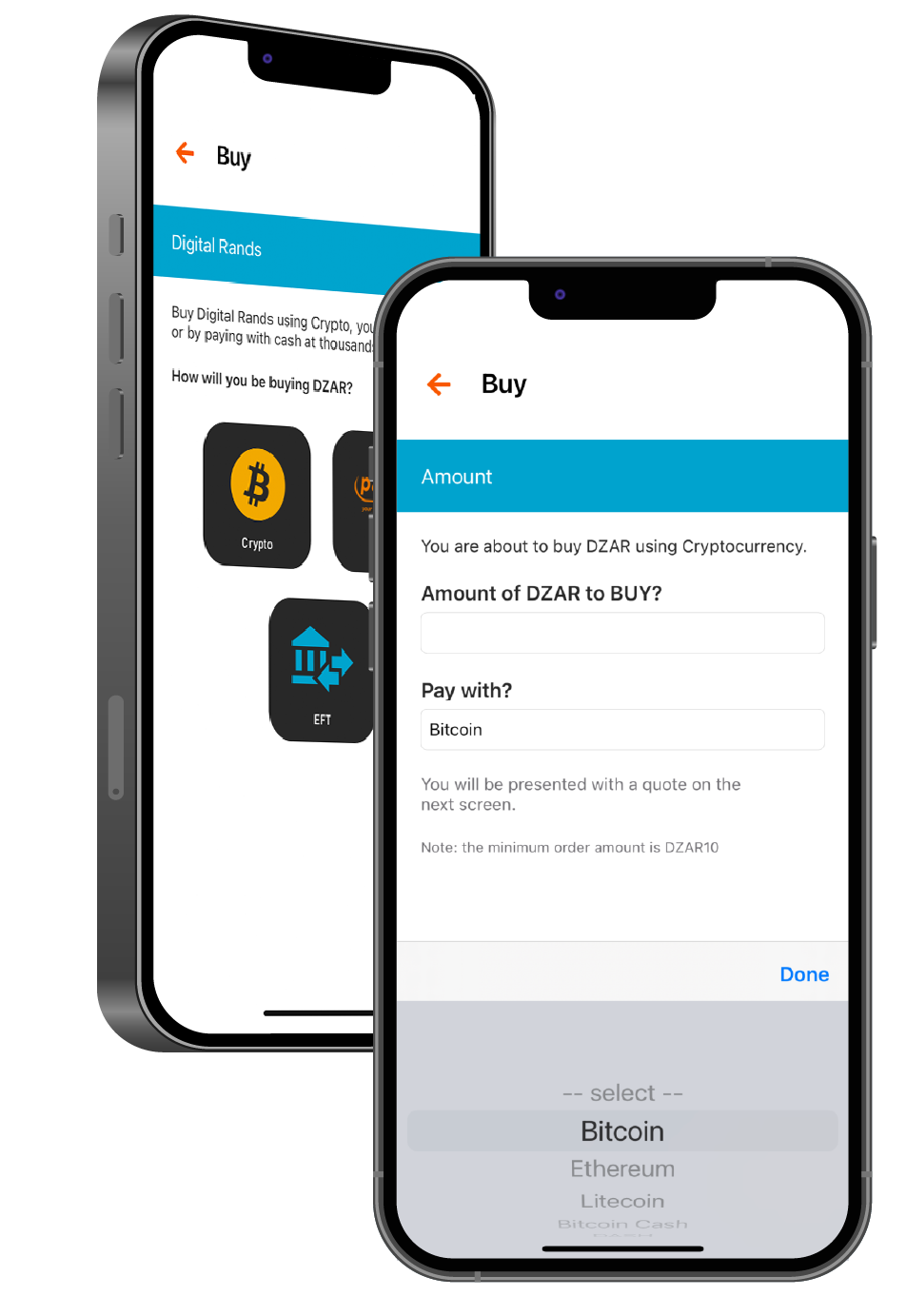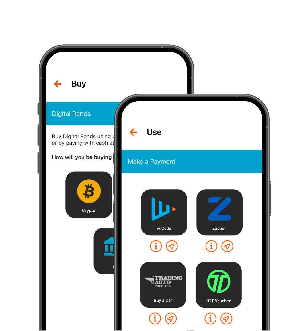 Purchase DZAR with your cryptocurrency of choice and use the 6DOT50 app to instantly spend online or in your favourite stores.