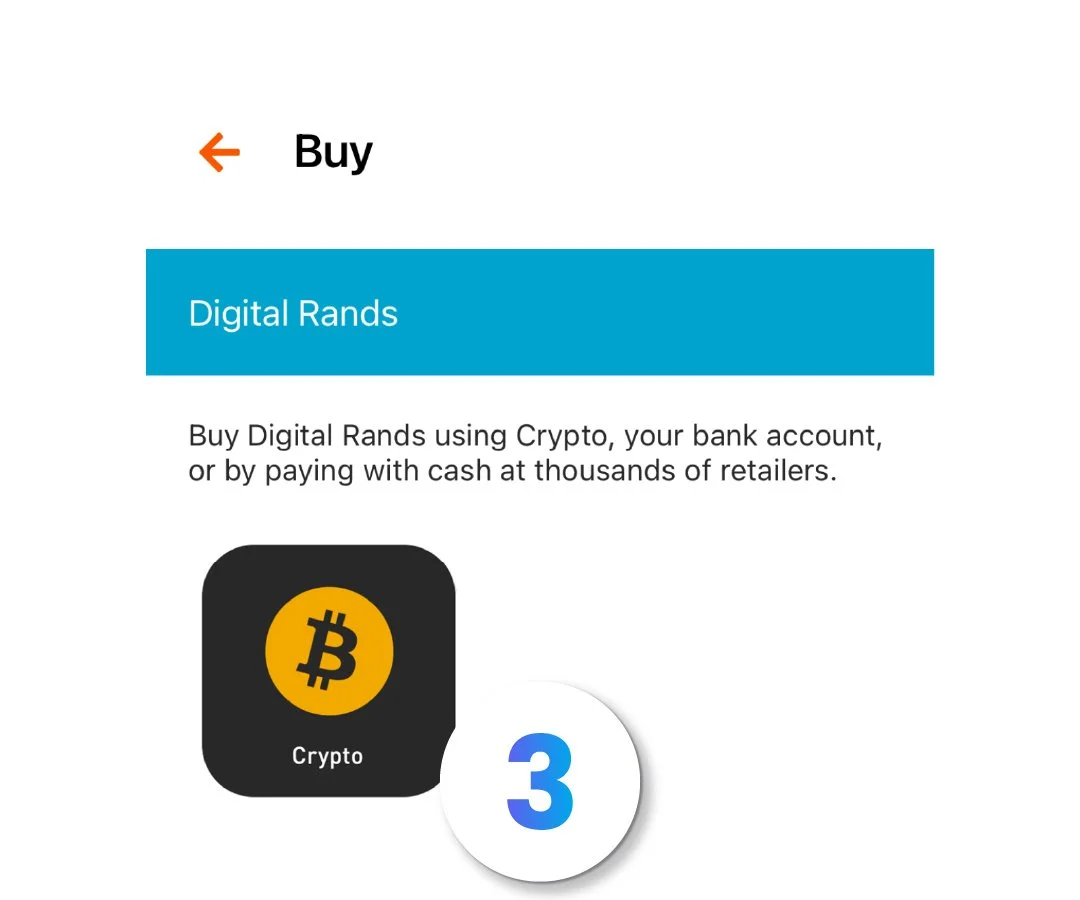 Click the BUY button and select crypto as your payment option. Buy DZAR with your crypto.